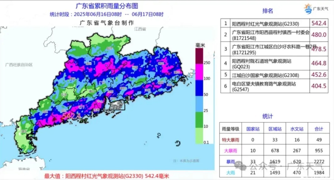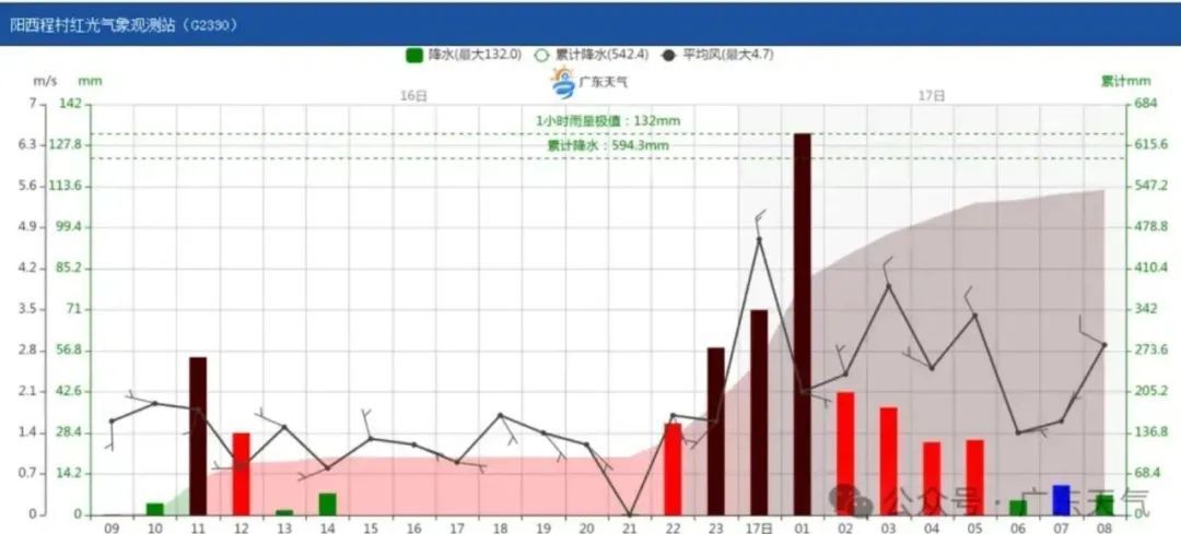 其中,阳江阳西县程村镇录得全省最大雨量542.4毫米和最大1小时雨量142.6毫米。