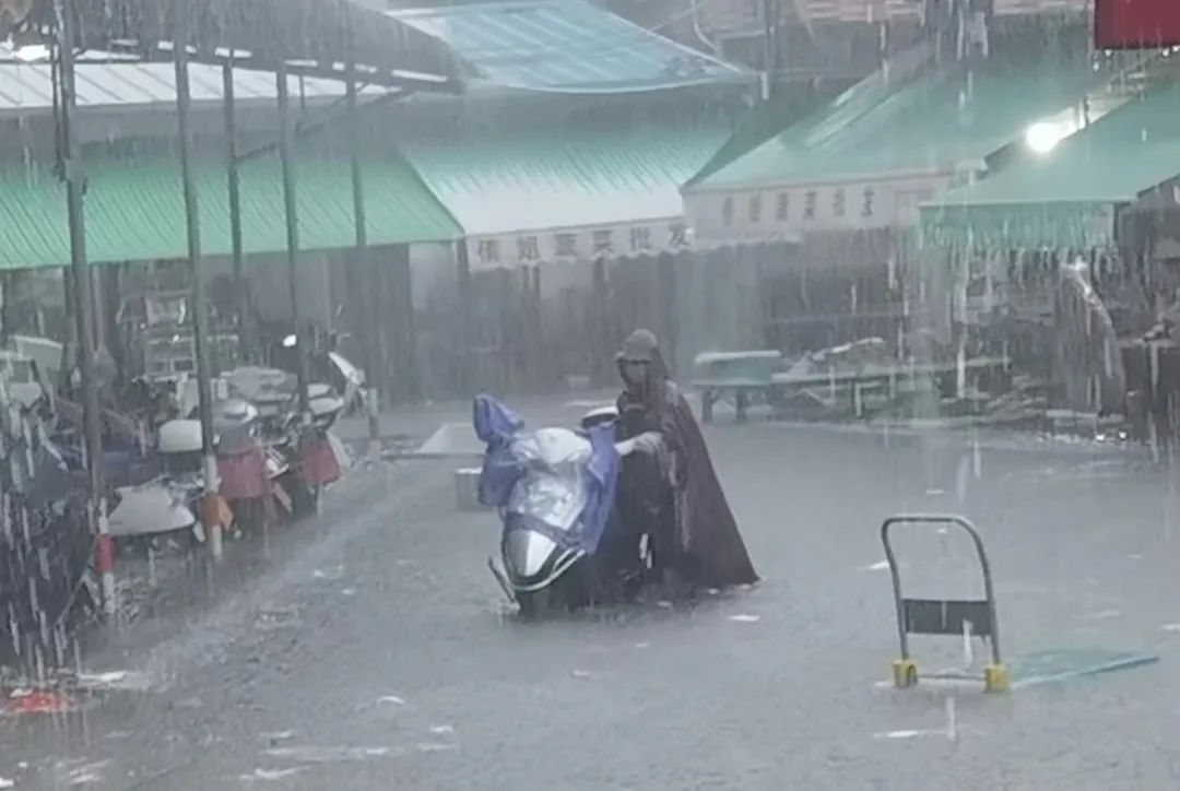 连夜的暴雨导致阳江市区第一市场“水浸街”,17日上午10时许,水深已经没过小腿,附近商户把货物转移至高处,有市民蹚水买菜。